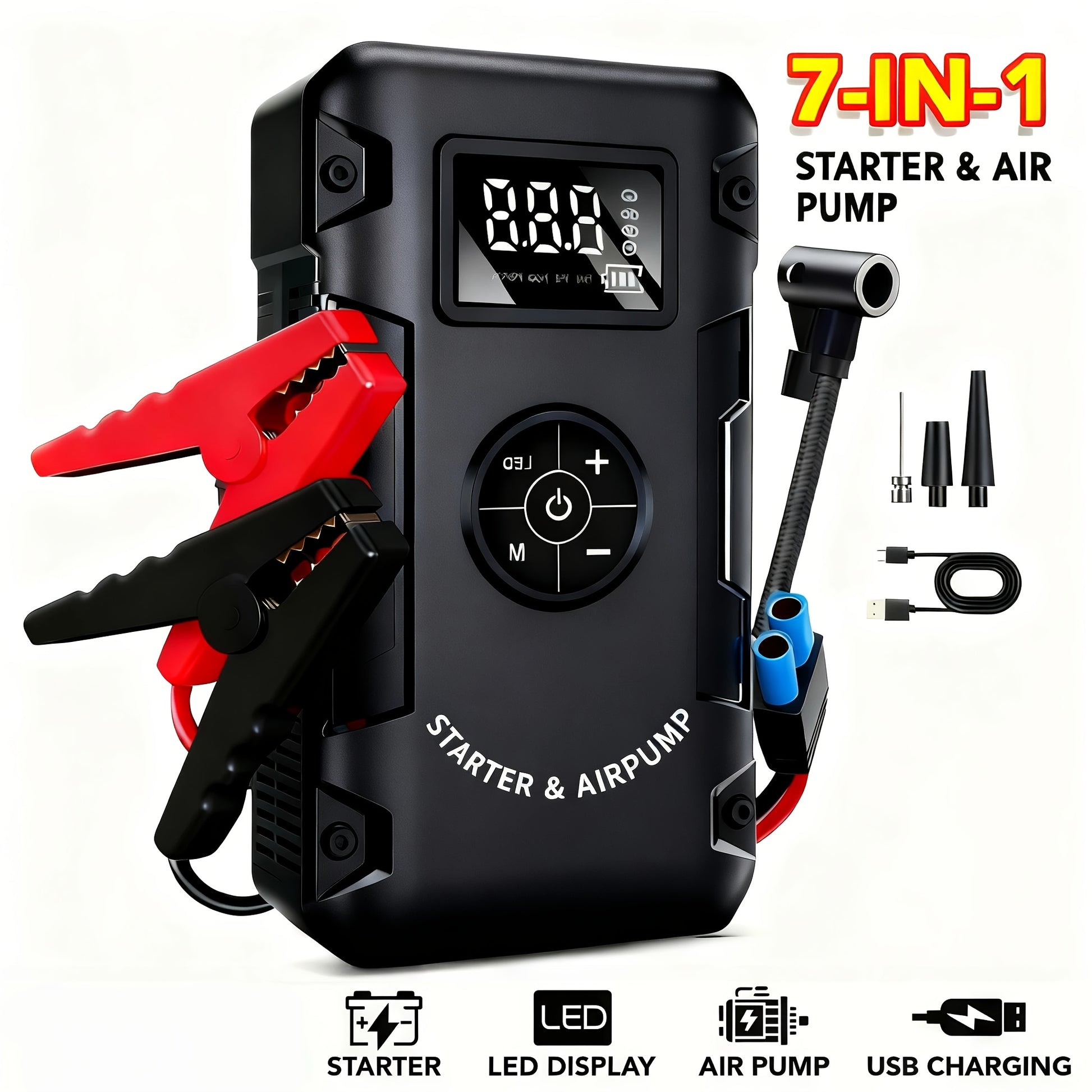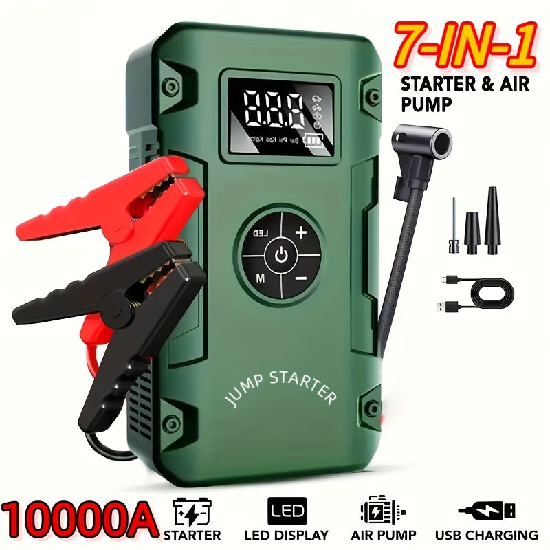 Stay prepared for any roadside emergency with the 7-in-1 Car Jump Starter, a compact yet powerful all-in-one solution designed for modern drivers. Built with a high-capacity 10000A peak current, this multifunctional device can instantly jump-start most cars, SUVs, and light trucks, making it a dependable companion for daily commutes and long road trips alike.